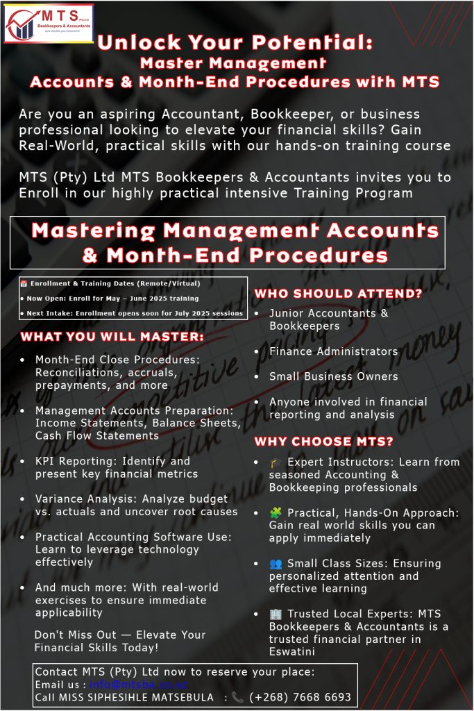 M T S (PTY) LTD t/a MTS Bookkeepers & Accountants provides tailored bookkeeping and accounting services. We focus on financial clarity, compliance, and growth. Our expert team empowers clients with insight. Community success drives our purpose.