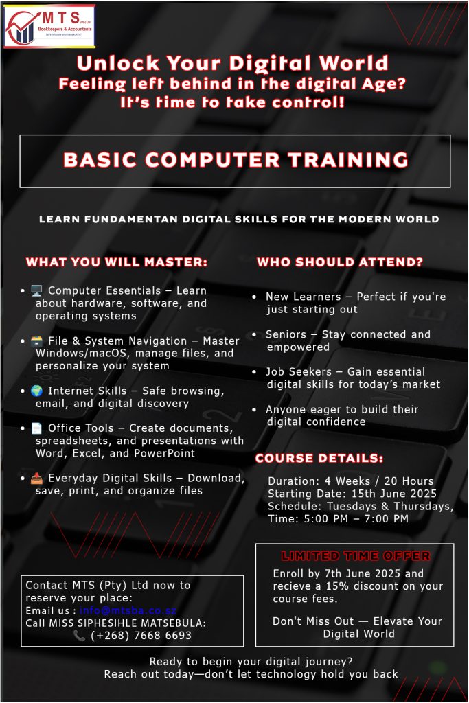 πŸš€ Unlock Your Digital World! πŸš€ Feeling left behind in the digital age? It's time to take control! Our Basic Computer Training is specifically designed for complete beginners, empowering you to confidently navigate the online world, boost your career, and connect with ease. No prior experience? No problem! ____________________ What You'll Master: β€’ Computer Essentials: Demystify hardware, software, and operating systems. β€’ Effortless Navigation: Become a pro at using Windows/macOS, managing files, and customizing settings. β€’ Internet Savvy: Safely browse the web, send emails, and discover online possibilities. β€’ Office Productivity: Get hands-on with Word (documents), Excel (spreadsheets), and PowerPoint (presentations). β€’ Practical Skills: Learn to download, save, print, and organize your digital life. ____________________ Who Is This For? β€’ Complete Beginners: If you've always wanted to learn but didn't know where to start. β€’ Seniors: Embrace technology to stay connected and engaged. β€’ Job Seekers: Gain essential skills that employers are looking for. β€’ Anyone eager to build their digital confidence! ____________________ Why Choose Us? β€’ Patient & Expert Instructors: Learn at your own pace in a friendly, supportive environment. β€’ Hands-on Learning: Practical exercises ensure you truly grasp every concept. β€’ Small Class Sizes: Enjoy personalized attention and get all your questions answered. β€’ Affordable Fees: Quality training that won't break the bank. β€’ Conveniently Located: Right here in Mbabane! ____________________ Course Details: β€’ Duration: 4 Weeks / 20 Hours β€’ Starting Date: 15th June 2025 β€’ Days & Times: Tuesdays & Thursdays, 5:00 PM - 7:00 PM _______________________________ πŸ”₯ Limited Time Offer! πŸ”₯ Enroll by 7th June 2025 and receive a 15% discount on your course fees! Don't miss out! ____________________ Don't let technology intimidate you any longer. Transform your future today! Ready to Begin Your Digital Journey? Contact Us Now